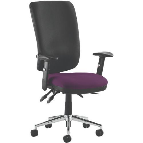 Approved by UK chiropractic doctors for posture support. Height adjustable backrest with fixed lumbar support. Contoured foam seat and back for extra comfort and support. Triple lever Synchro tilt mechanism. Seat slide. Polished chrome 5-star base with robust castors.