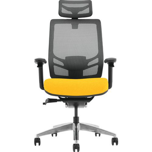 Designer fabric finish. Multi-functional synchronised tilt mechanism. Adjustable lumbar support. Seat slide included. Ratchet adjustable arms and backrest. Pivoting soft padded arms. Chrome robust frame and 5-star base.