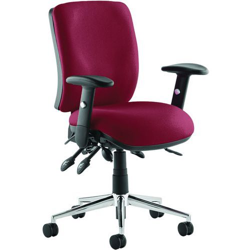Approved by UK chiropractic doctors for posture support. Height adjustable backrest with fixed lumbar support. Contoured foam seat and back for extra comfort and support. Triple lever Synchro tilt mechanism. Seat slide. Polished chrome 5-star base with robust castors.