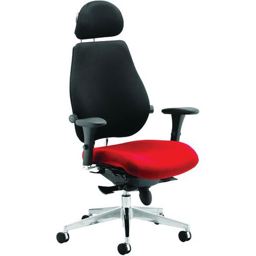 Approved by UK chiropractic doctors for posture support. Height adjustable backrest with fixed lumbar support. Contoured foam seat and back for extra comfort and support. Triple lever Synchro tilt mechanism. Seat slide. Polished chrome 5-star base with robust castors.