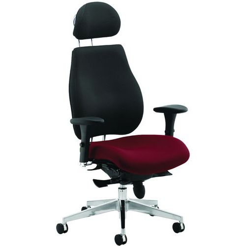 Approved by UK chiropractic doctors for posture support. Height adjustable backrest with fixed lumbar support. Contoured foam seat and back for extra comfort and support. Triple lever Synchro tilt mechanism. Seat slide. Polished chrome 5-star base with robust castors.