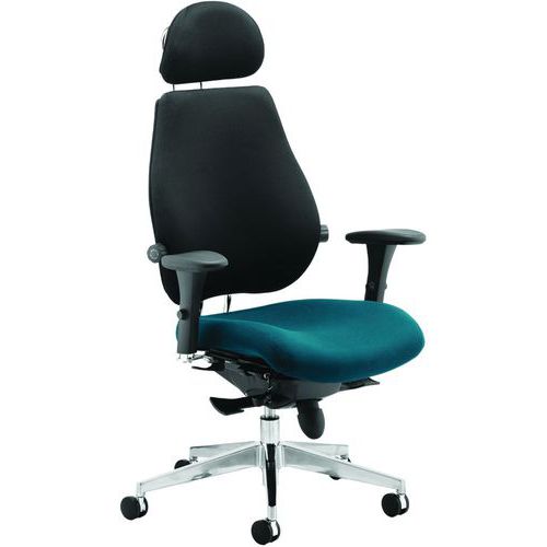 Approved by UK chiropractic doctors for posture support. Height adjustable backrest with fixed lumbar support. Contoured foam seat and back for extra comfort and support. Triple lever Synchro tilt mechanism. Seat slide. Polished chrome 5-star base with robust castors.