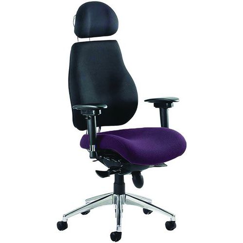 Approved by UK chiropractic doctors for posture support. Height adjustable backrest with fixed lumbar support. Contoured foam seat and back for extra comfort and support. Triple lever Synchro tilt mechanism. Seat slide. Polished chrome 5-star base with robust castors.