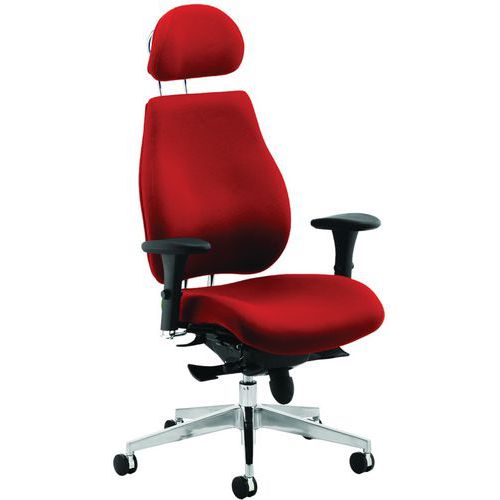 Approved by UK chiropractic doctors for posture support. Height adjustable backrest with fixed lumbar support. Contoured foam seat and back for extra comfort and support. Triple lever Synchro tilt mechanism. Seat slide. Polished chrome 5-star base with robust castors.