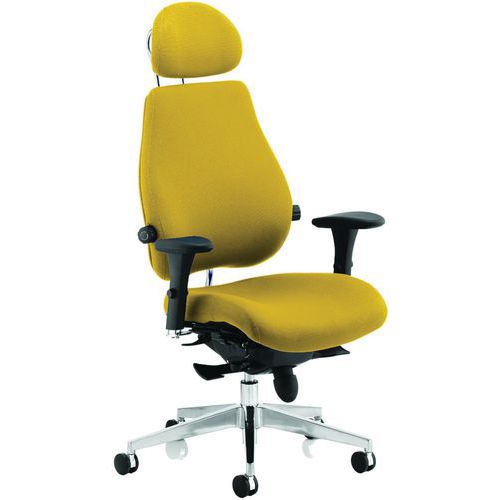 Approved by UK chiropractic doctors for posture support. Height adjustable backrest with fixed lumbar support. Contoured foam seat and back for extra comfort and support. Triple lever Synchro tilt mechanism. Seat slide. Polished chrome 5-star base with robust castors.