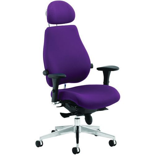 Approved by UK chiropractic doctors for posture support. Height adjustable backrest with fixed lumbar support. Contoured foam seat and back for extra comfort and support. Triple lever Synchro tilt mechanism. Seat slide. Polished chrome 5-star base with robust castors.