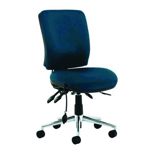 Approved by UK chiropractic doctors for posture support. Height adjustable backrest with fixed lumbar support. Contoured foam seat and back for extra comfort and support. Triple lever Synchro tilt mechanism. Seat slide. Polished chrome 5-star base with robust castors.
