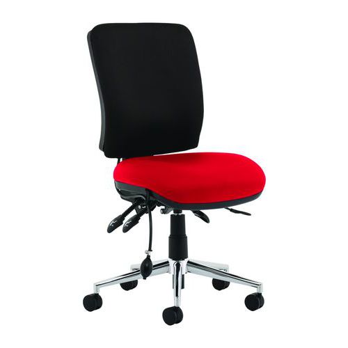 Approved by UK chiropractic doctors for posture support. Height adjustable backrest with fixed lumbar support. Contoured foam seat and back for extra comfort and support. Triple lever Synchro tilt mechanism. Seat slide. Polished chrome 5-star base with robust castors.