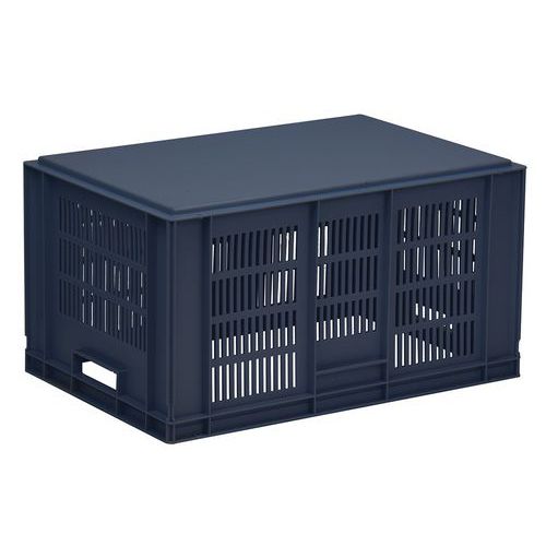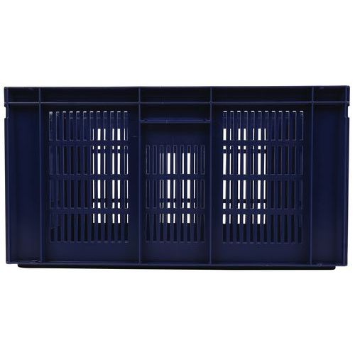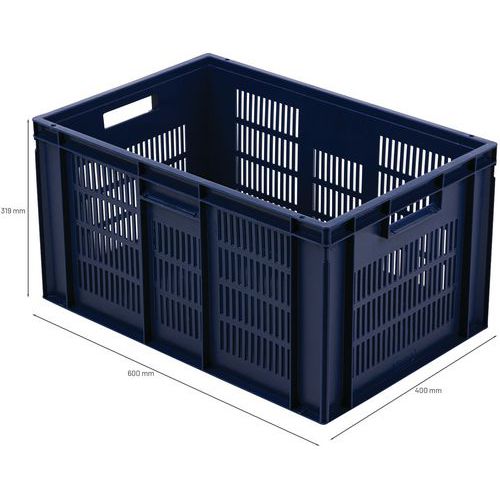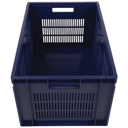 Blue European standard tray with good stacking stability. Openwork sides for guaranteed ventilation. Easy to move thanks to its large open handles. Resistance to oils, greases and many chemicals.
