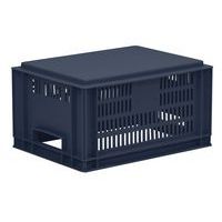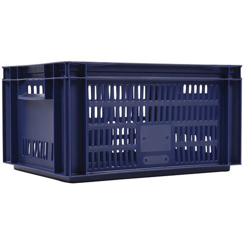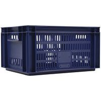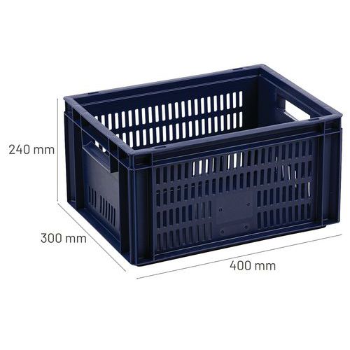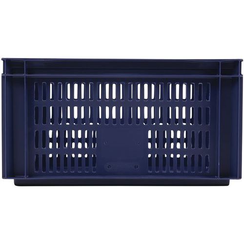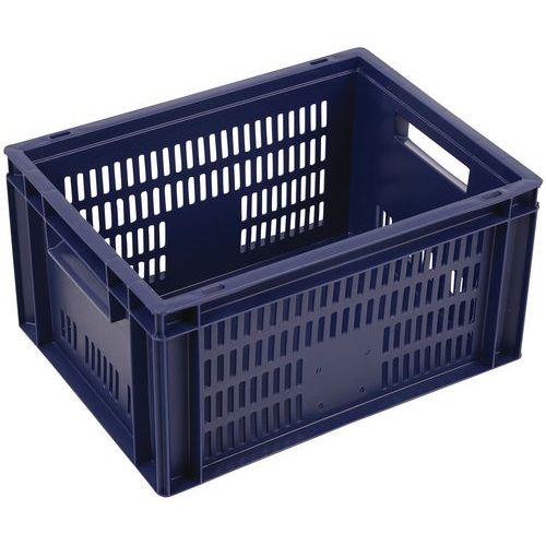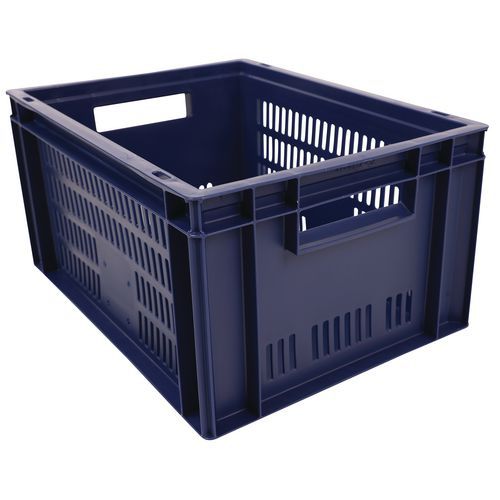 Blue European standard tray with good stacking stability. Openwork sides for guaranteed ventilation. Easy to move thanks to its large open handles. Resistance to oils, greases and many chemicals.
