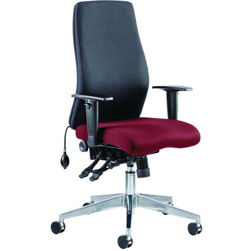 Contoured foam seat and backrest for maximum user comfort. Triple lever multi-function mechanism. Ratchet height adjustable backrest. Pump up lumbar support. Seat slide. Height adjustable arms. Brushed aluminium 5-star base with castors. UK crib five foam and fabric.