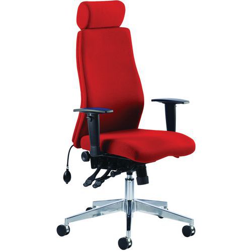 Contoured foam seat and backrest for maximum user comfort. Triple lever multi-function mechanism. Ratchet height adjustable backrest. Pump up lumbar support. Seat slide. Height adjustable arms. Brushed aluminium 5-star base with castors. UK crib five foam and fabric.