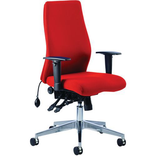Contoured foam seat and backrest for maximum user comfort. Triple lever multi-function mechanism. Ratchet height adjustable backrest. Pump up lumbar support. Seat slide. Height adjustable arms. Brushed aluminium 5-star base with castors. UK crib five foam and fabric.