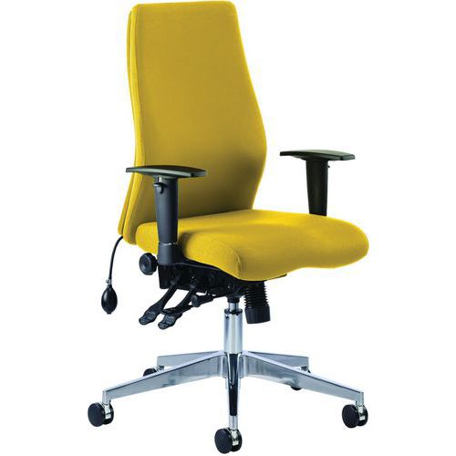 Contoured foam seat and backrest for maximum user comfort. Triple lever multi-function mechanism. Ratchet height adjustable backrest. Pump up lumbar support. Seat slide. Height adjustable arms. Brushed aluminium 5-star base with castors. UK crib five foam and fabric.