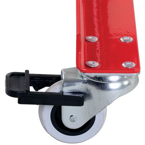 Powder coated. With self-locking nuts in the extendable area. With reflective warning marking on both sides. Very easy to use. Includes brake on castor.