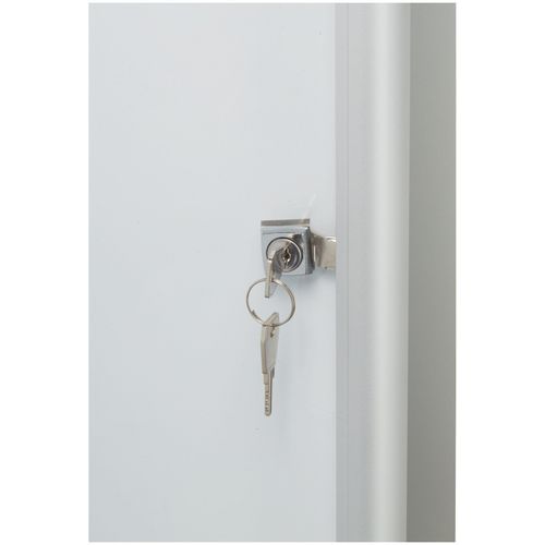 Extra flat glazed case 22-mm deep. Display case for use in corridors and high-traffic work areas. White metal surface for attaching documents with magnets or writing messages with drywipe markers. Acrylic door with lock and 2 keys. Wall-mounting kit included. One-year warranty.