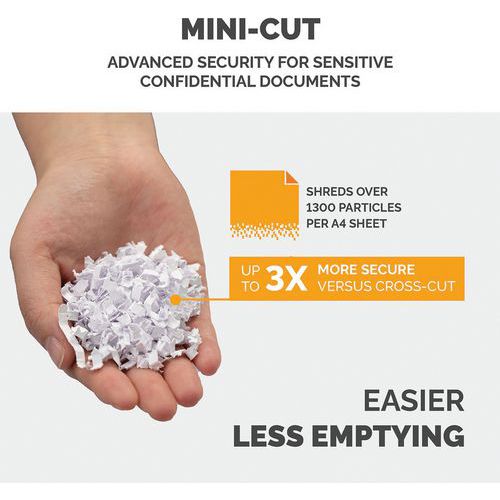 Complies with DIN P-4 (advanced high security) and cuts the paper into tiny 4 x 12mm mini-cut particles - three times more secure than standard cross-cut shredders.