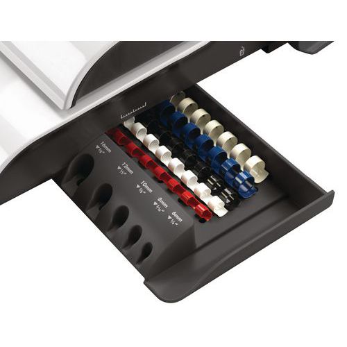 Easy binding thanks to the inclined ring support teeth Adjustable edge guide to precisely align all your documents Storage drawer with loader for bindings and documents Chip drawer opens automatically to prevent jams Binding capacity 300 pages with spine having a maximum dimension of 38 mm. Punches and binds