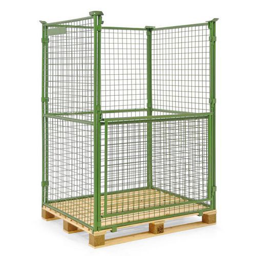 - Clip on foldable mesh pallet cage compatible with 1000x1000mm and Euro pallets, ideal for warehouse racking systems.