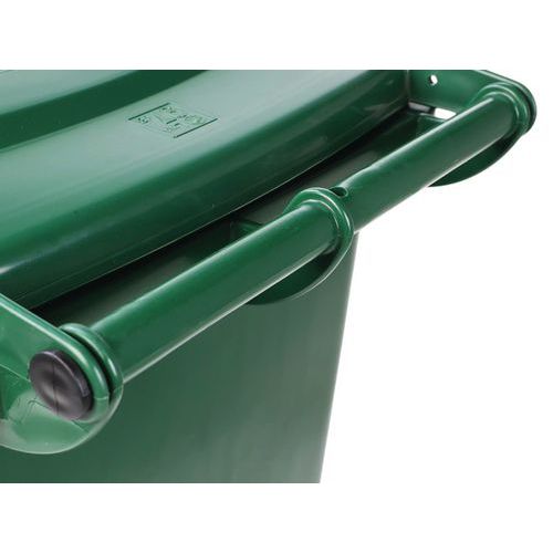 Practical and easy-to-handle wheelie bin with sturdy handles and wheels. Available in several colours to make waste sorting and content identification easier. Solid wheels with a 200 mm diameter. Made from premium high-density polyethylene (HDPE). UV- and impact-resistant. Container resistant to chemical agents and protected from harmful insects. Does not absorb liquids, washable and sterilizable.