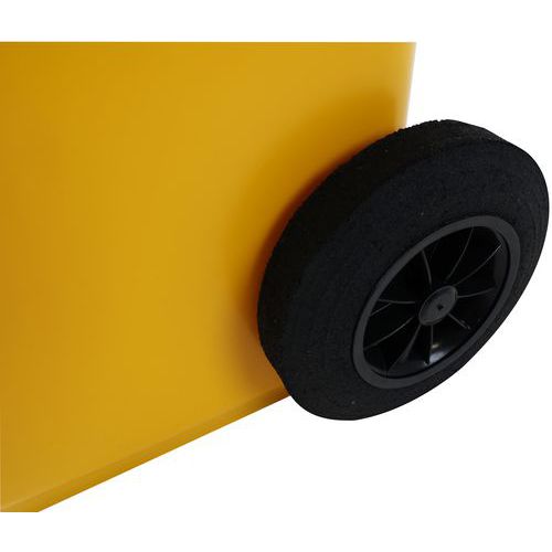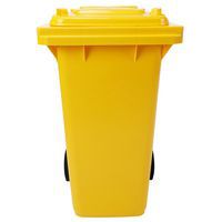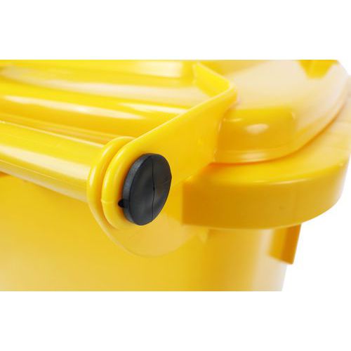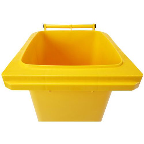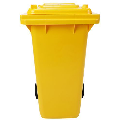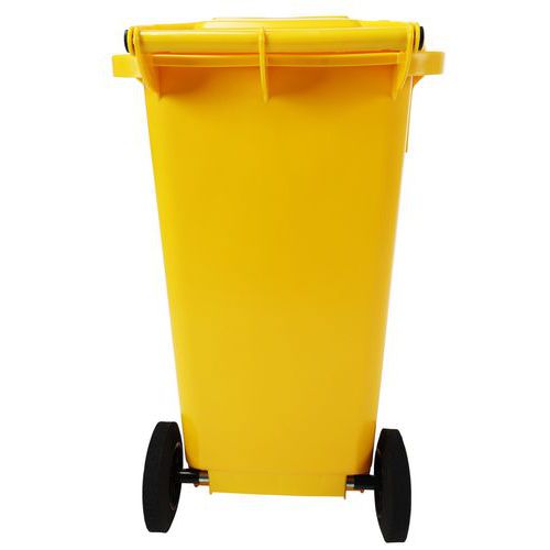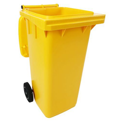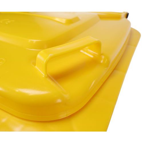 Practical and easy-to-handle wheelie bin with sturdy handles and wheels. Available in several colours to make waste sorting and content identification easier. Solid wheels with a 200 mm diameter. Made from premium high-density polyethylene (HDPE). UV- and impact-resistant. Container resistant to chemical agents and protected from harmful insects. Does not absorb liquids, washable and sterilizable.