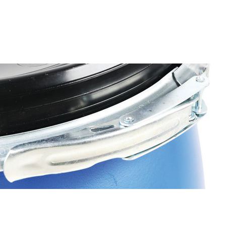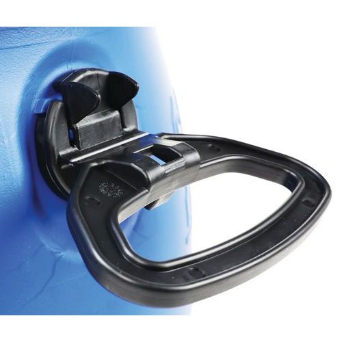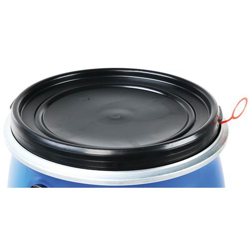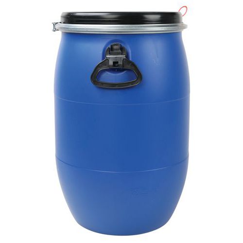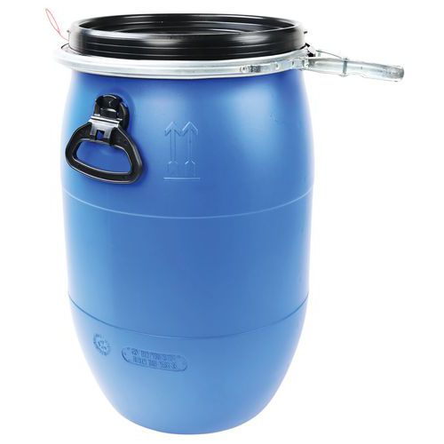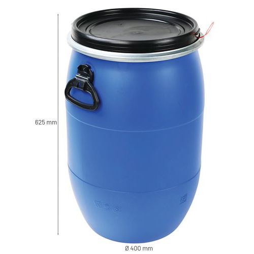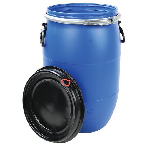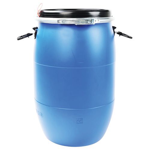 HDPE cylindrical drum for secure storage and transport. Jointed lid with sealable galvanized steel circle and lever. UN approved for transport of hazardous materials. Black lid with an EPDM seal. The 120-l and 200-l models do not have handles.