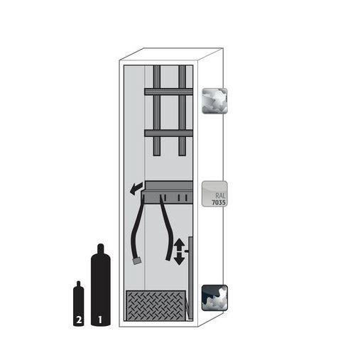 Storage of flammable or toxic gases in work areas. Sturdy and durable thanks to its steel external structure. Protection against unauthorised use with lockable door(s) featuring a central locking system. Easy installation with built-in adjustable feet. Multiple routing points above the cabinet for easy installation of pipes and fittings.