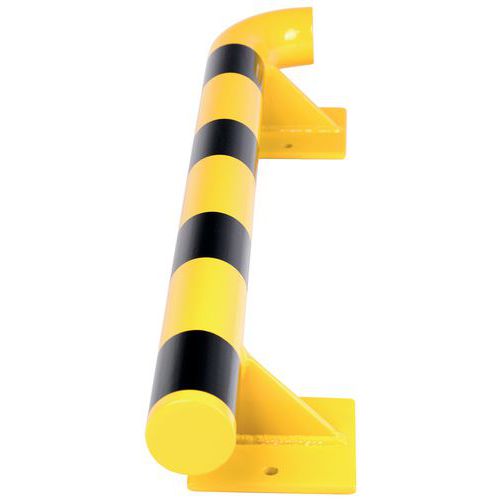 Wall protection stop made of robust steel for effective shock absorption. Good visibility thanks to its yellow/black colour. Galvanized steel offering increased resistance to abrasion and corrosion. Easy installation thanks to its mounting plate to be anchored. Plate 195 x 120 mm.