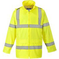 Practical yellow high-visibility rain jacket. Reflective stripes resist heat and improve visibility at night. Easy to clean.