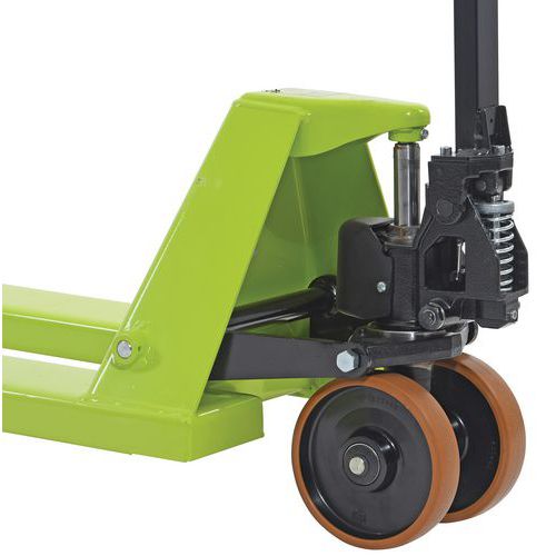 Pallet truck with 2500kg capacity and a cast iron housing.
