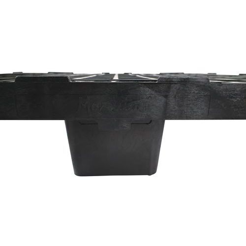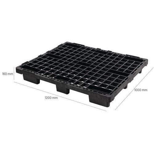 Openwork, ergonomic and lightweight industrial pallet. Non-porous recycled material that will not absorb liquids. One-piece construction (formed from a single unit). Edge to keep items stored on the pallet in place. Ultra-hygienic: can be washed with a high-pressure washer and disinfected. Ideal for the pharmaceutical and food-processing industries, as well as retail.