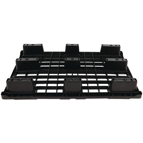 Openwork, ergonomic and lightweight industrial pallet. Non-porous recycled material that will not absorb liquids. One-piece construction (formed from a single unit). Edge to keep items stored on the pallet in place. Ultra-hygienic: can be washed with a high-pressure washer and disinfected. Ideal for the pharmaceutical and food-processing industries, as well as retail.