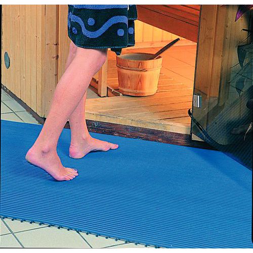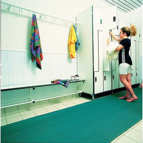 Roll of non-slip matting for communal areas. Hygienic, non-porous material with antimicrobial and antifungal additives. Innovative design for ultra-efficient water drainage. Matting is easy to cut, fit and remove. Non-slip embossing for excellent stability.