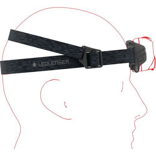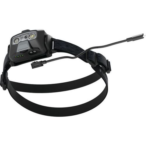- Rechargeable head torch with three brightness levels and a red light at the front.