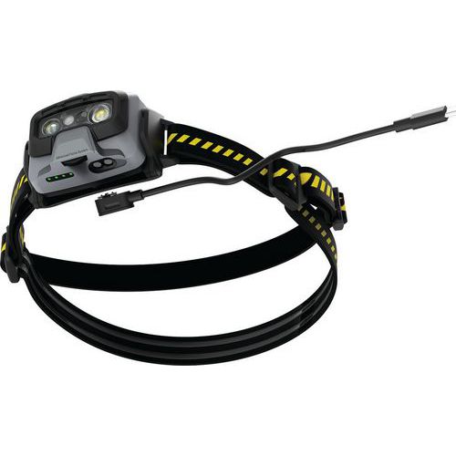 - Rechargeable head torch with three brightness levels and a red light at the front.