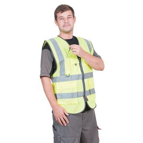 Yellow zipped waistcoat with ID, mobile phone and pen pockets.
