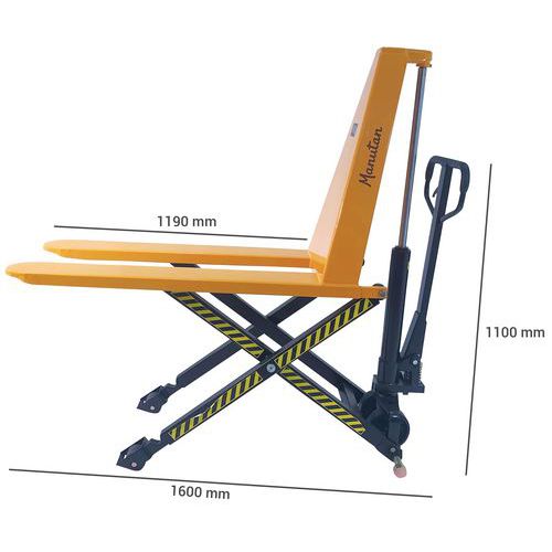- Ergonomic high-lift manual pallet truck for moving and placing goods when working at height.