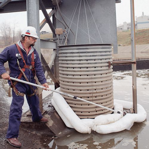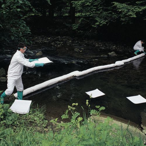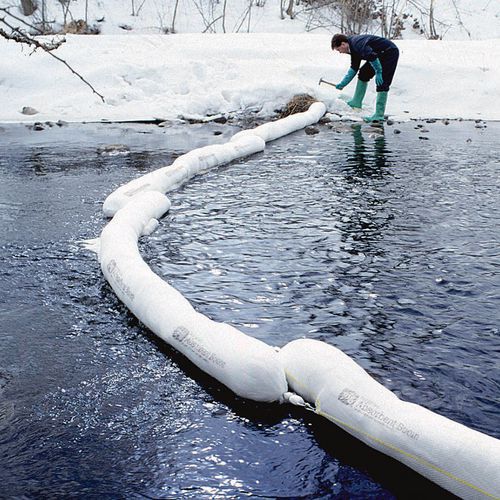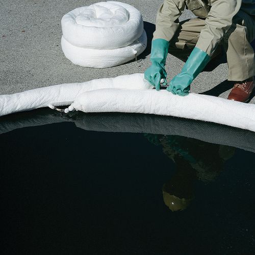 Absorbent barrier floats when fully saturated. Assembly with steel hooks to cover a wider area. Reinforced, UV resistant skin. White colour means spills are immediately visible.