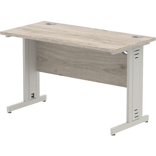 Melamine finish with a 2mm ABS durable, protective edge. 18mm modesty panel. Two cable ports to help keep a 'clean desk' environment. Features floor levellers, to level the desk on uneven floors and prevent rocking. Rather than screw directly into the wood or plastic, these desks screw in from steel to steel, which is more robust prevents damage if it needs to be dismantled and moved.