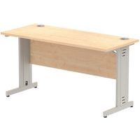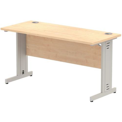 Melamine finish with a 2mm ABS durable, protective edge. 18mm modesty panel. Two cable ports to help keep a 'clean desk' environment. Features floor levellers, to level the desk on uneven floors and prevent rocking. Rather than screw directly into the wood or plastic, these desks screw in from steel to steel, which is more robust prevents damage if it needs to be dismantled and moved.