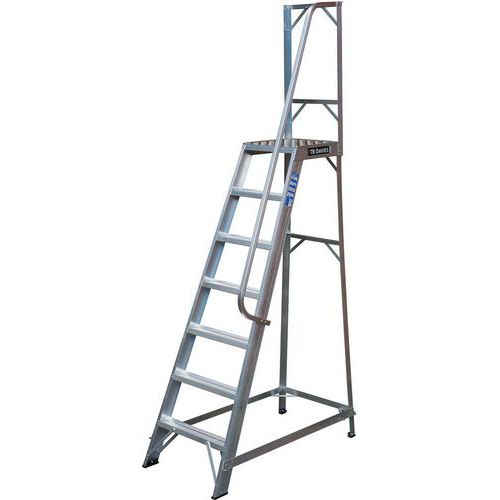 80 mm deep serrated treads. Comfortable 421 x 405 x 70 mm checker plate platform. Handrail supplied loose. Constructed from heavy-duty channel section aluminium. 3-year guarantee.