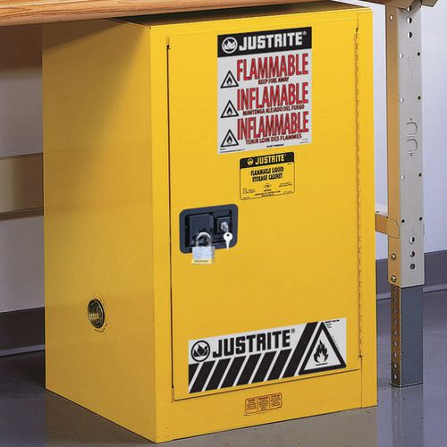 Compact flammable storage cabinet, perfect when storing lesser quantities of liquids.