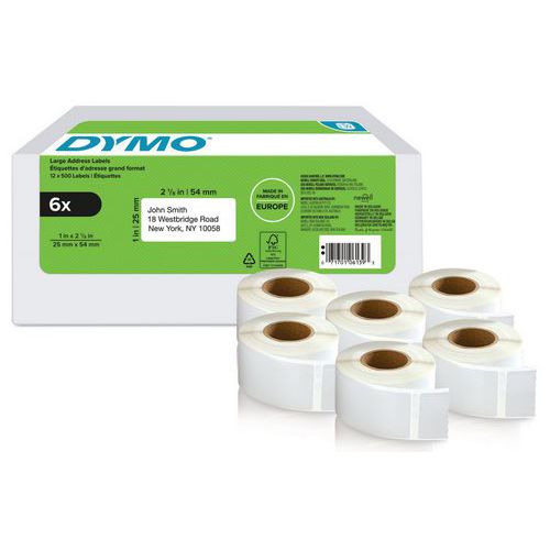 DYMO® LW paper labels, easy to print whether a single label or hundreds of labels. Direct thermal printing technology for crisp text without using expensive and messy ink or toner. No more paper jams, layout problems or waste. Large self-adhesive return labels in pre-cut white paper. Made in the EU Made in the EU Customer warranty : Legal guarantee
