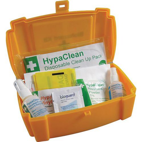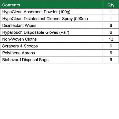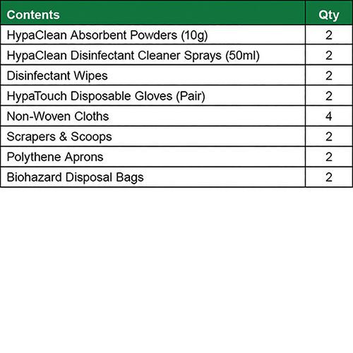 - All kits contain disinfectant spray, HypaClean Disposable Clean Up Packs and absorbent granules with a deodoriser.