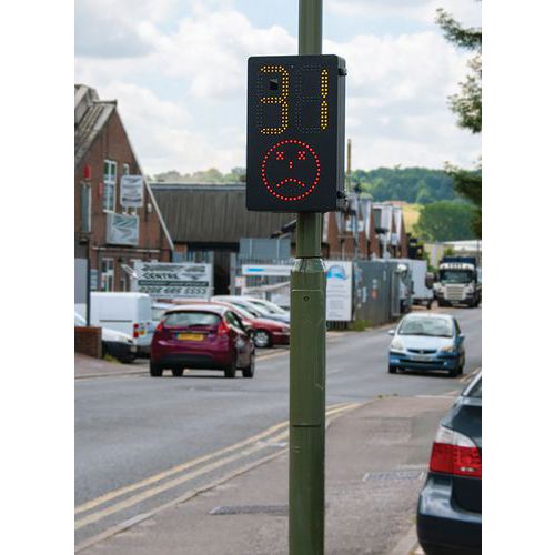 Displays the speed of any oncoming vehicle along with a red ‘sad face’ for speeding vehicles and a green ‘smiley face’ for vehicles travelling within the speed limit. UKCA/CE Certified. Easily relocatable using custom post plates. Integrated Vehicle Detection RADAR. Viewable for up to 100 metres. User-adjustable ‘Trigger Speed’ (5 - 65MPH) and ‘Display Duration’ (0.5 - 7.5 seconds). Auto-dim facility for day and nighttime use. Requires minimal power for efficiency. Vehicle data capture option available. 4G Modem Upgrade: Allows remote access for data download, trigger speed changes and scheduling options. Fully weatherproof. Mains-powered speed signs use the power grid to keep the sign running. Battery-powered speed signs offer a more mobile solution to speeding in your area. The Solar power option enables speed signs to operate using renewable energy. The Data Capture function records a) the speed of every motorist driving past your sign and b) the date and time of each record. Customer warranty : 6 years