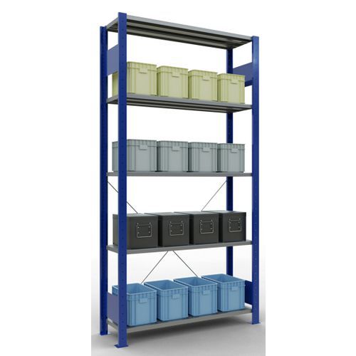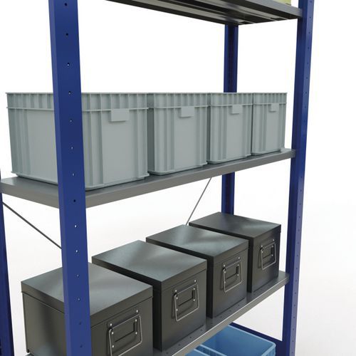 Robust and comprehensive shelving system with an attractive grey or blue epoxy paint finish. Sheet-steel solid shelves that can hold goods of various sizes. Industrial shelving is easy and quick to assemble by slotting the parts together and does not require the use of any particular tools. Shelving is easy to extend by adding 1 or more add-on units.