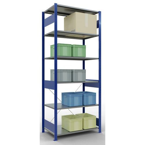 Robust and comprehensive shelving system with an attractive grey or blue epoxy paint finish. Sheet-steel solid shelves that can hold goods of various sizes. Industrial shelving is easy and quick to assemble by slotting the parts together and does not require the use of any particular tools. Shelving is easy to extend by adding 1 or more add-on units.