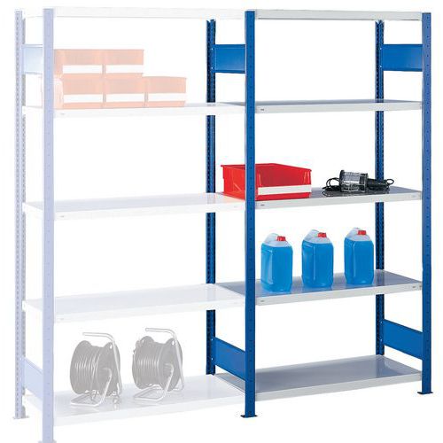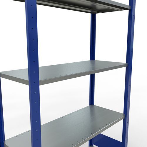 Robust and comprehensive shelving system with an attractive grey or blue epoxy paint finish. Sheet-steel solid shelves that can hold goods of various sizes. Industrial shelving is easy and quick to assemble by slotting the parts together and does not require the use of any particular tools. Shelving is easy to extend by adding 1 or more add-on units.