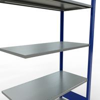 Robust and comprehensive shelving system with an attractive grey or blue epoxy paint finish. Sheet-steel solid shelves that can hold goods of various sizes. Industrial shelving is easy and quick to assemble by slotting the parts together and does not require the use of any particular tools. Shelving is easy to extend by adding 1 or more add-on units.