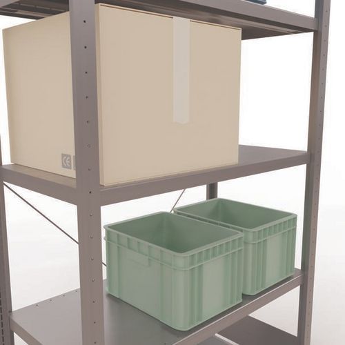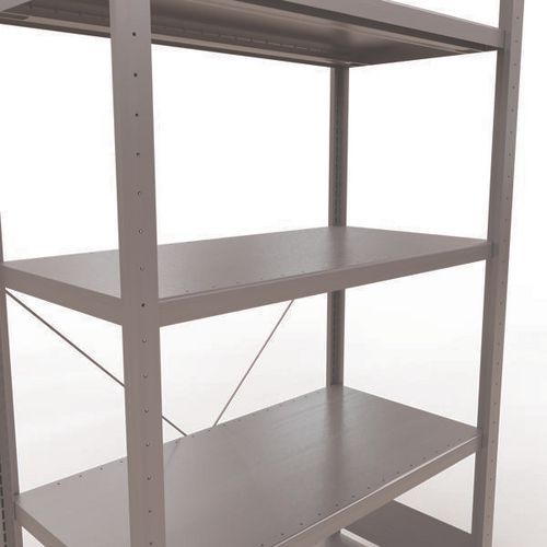 Robust warehouse shelving with a galvanised finish that is highly resistant to damp environments. Sheet-steel solid shelves that can hold goods of various sizes. Industrial shelving is easy and quick to assemble by slotting the parts together and does not require the use of any particular tools. Shelving is easy to extend by adding 1 or more add-on units. Distance between perforations: 25 mm. Height of the first perforation: 50 mm. Height of the first perforation: 22.5 mm.